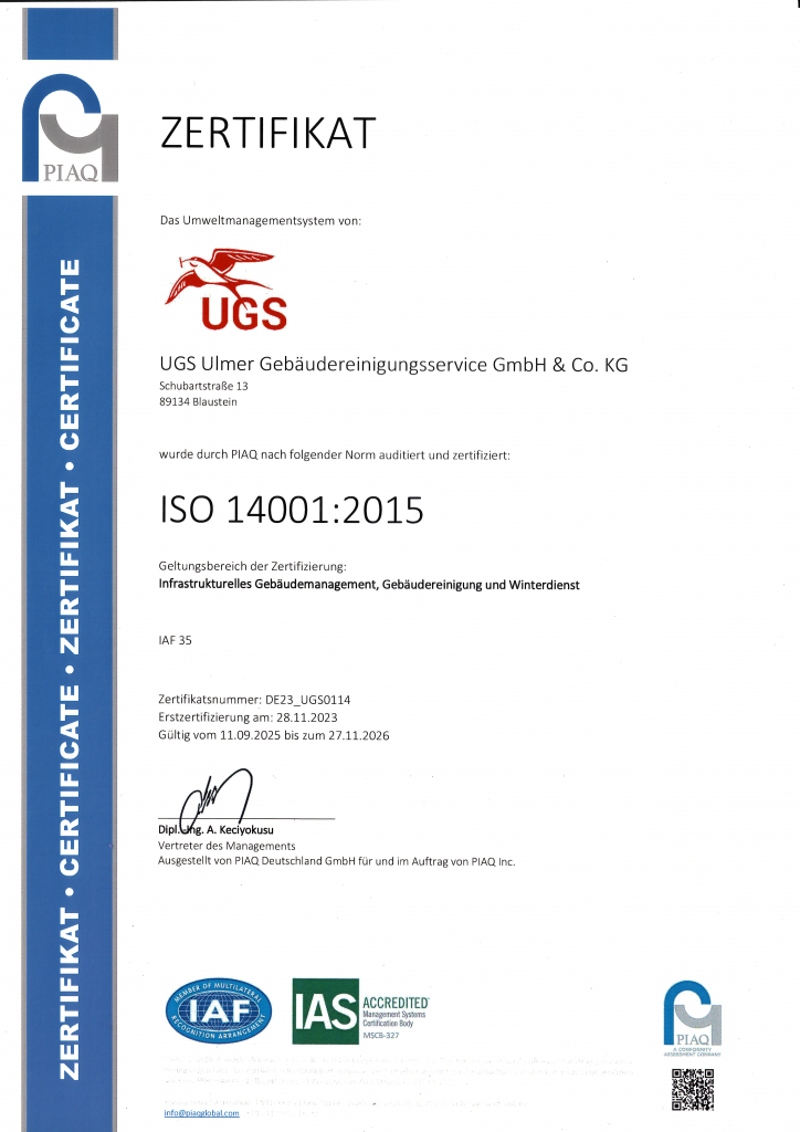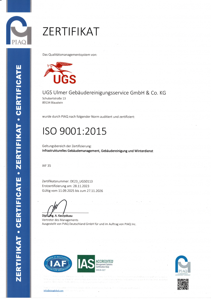 Unser Versprechen: „UGS der SAUBERKEIT wegen …“ steht für Sauberkeit und Qualität, mit unserem nach ISO 9001:2015 zertifizierten Qualitätsmanagementsystem garantieren wir Ihnen eine hohe Qualität unserer Leistungen in: